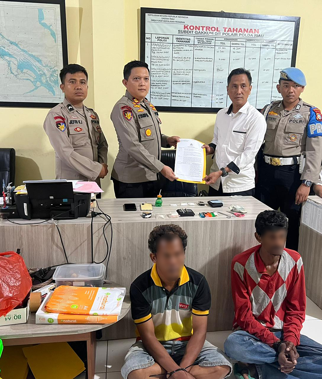 Natuna, 01/06/2021 – Satuan Polisi Air dan Udara (Sat Polairud) Polres Natuna berhasil mengamankan 7 (tujuh) orang pelaku pengeboman ikan di perairan Midai, Kecamatan Midai, Kabupaten Natuna, Sabtu (29/05/21) sekitar Pukul 10.00 WIB.Hal itu disampaikan oleh Kepala Sat Polairud Polres Natuna, Iptu Sandi Pratama.S.I.K kepada Awak Media saat menggelar konferensi pers di Polres Natuna, Jalan H. Adam Malik, Bandarsyah, Senin (31/5/2021) siang.