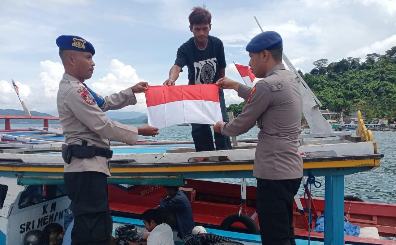 Menyambut Hari Ulang Tahun (HUT) ke-80 Kemerdekaan Republik Indonesia, Satuan Polisi Air dan Udara (Sat Polairud) Polres Pesawaran bersama Dit Polairud Polda Lampung menggelar aksi pembagian Bendera Merah Putih di perairan Kabupaten Pesawaran, Selasa (12/8/2025).